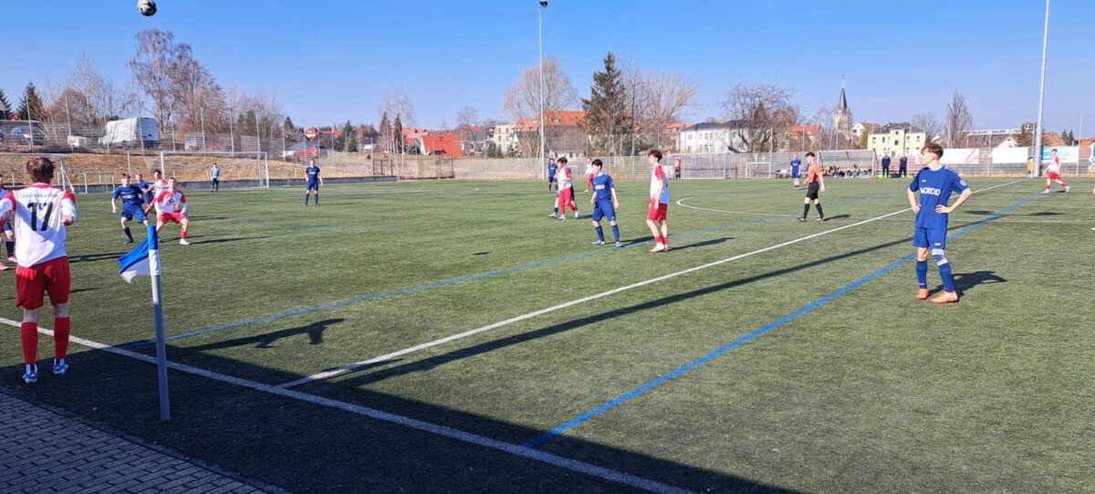 So begann der Gast gleich sehr druckvoll, so dass wir gar nicht groß aus der eigenen Hälfte herauskamen. Aber das 0:1 haben wir mal wieder selber gamacht nach einem groben Schnitzer in unserer Abwehr. Danach kommen wir besser ins Spiel rein und haben unsere erste gute Chance durch Alex. Annaberg blieb stets gefährlich durch ihre schnelle und aggressive Spielweise. Wir haben mit Kampf und Willen dagegengehalten und so das 1:1 erzielt durch Tom, auf Vorlage von Toni, der einen langen Ball nicht aufgegeben hat. Daraufhin erhöhte der Gast den Druck und wir hatten sehr viel Glück und einmal Finn, dass es bei 1:1 blieb. Unsere guten Ecken und eine gute Torchance von Tom blieben ungenutzt.